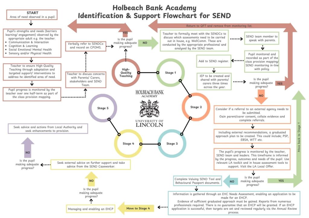 At Holbeach Bank Academy we pride ourselves delivering High Quality Teaching which supports the early identification of pupil’s with Special Educational Needs and Disabilities. At HBA we look to extend what is already available to pupils and to further develop an inclusive environment. Early involvement helps to identify the pupils core area of need which provides the foundation to plan a bespoke provision to build upon. This then allows children to have high aspirations and provides them with the scaffolding that they need to achieve.